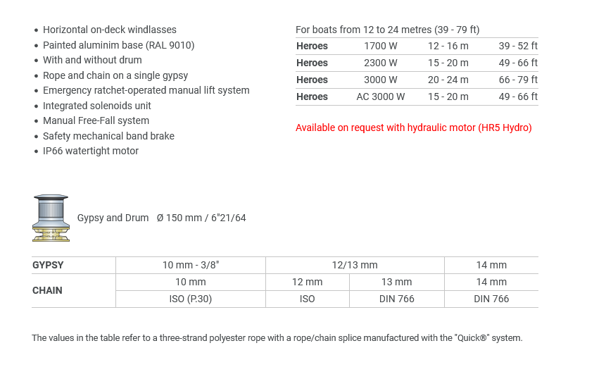 QUICK Heroes (HR5) – Palubni model sidrenog vitla sa vodoravnom osovinom. Namijenjen brodovima od 12 do 24 metra. HR5 modeli su dostupni samo na upit zbog mnogobrojnih opcija, raspoloživi su od 1700W 12/24V – 3500W 24V. 2200W 220V